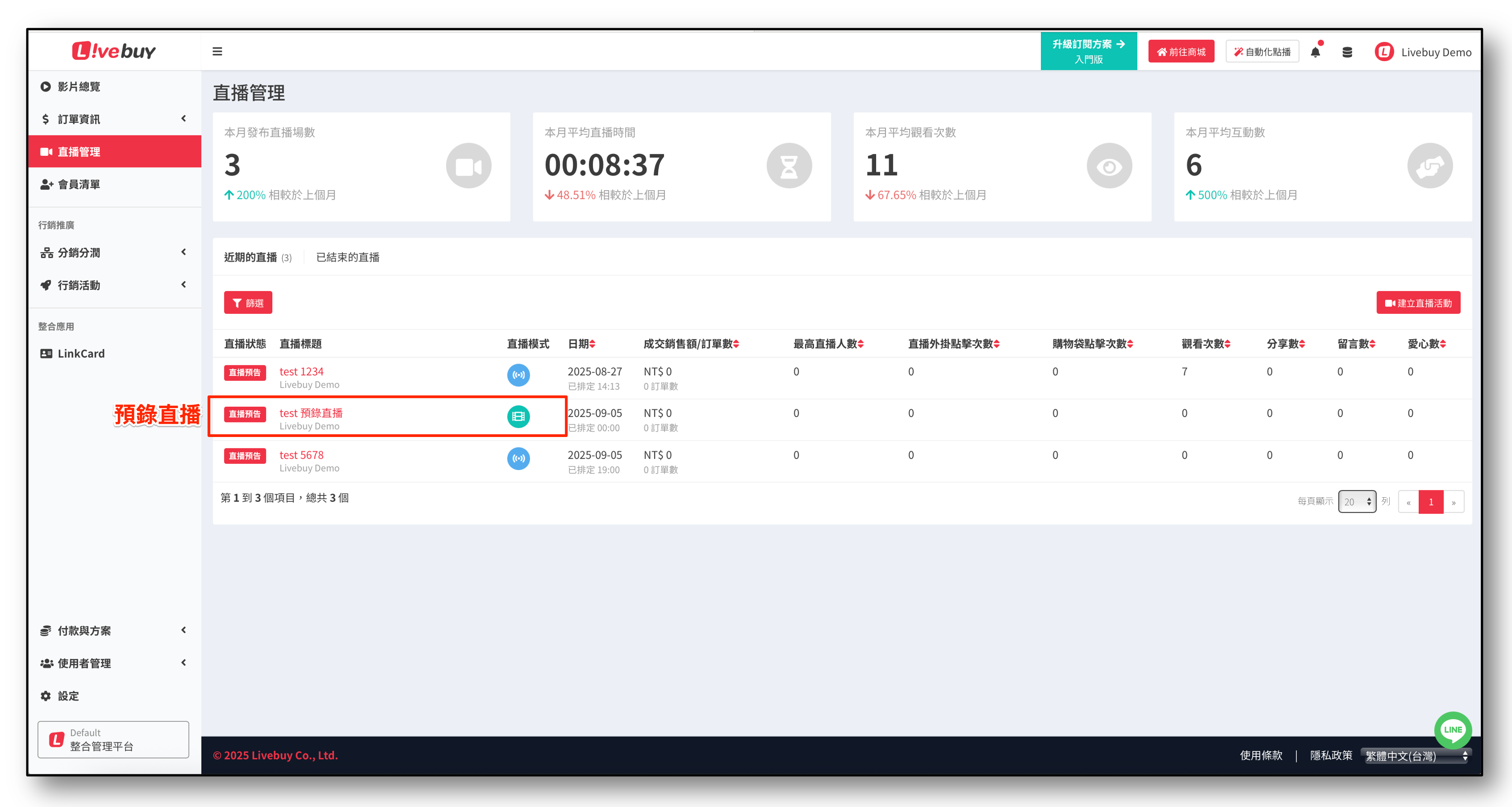 當您完成以上所有預錄直播設定後,直播管理介面會出現有預錄直播圖示