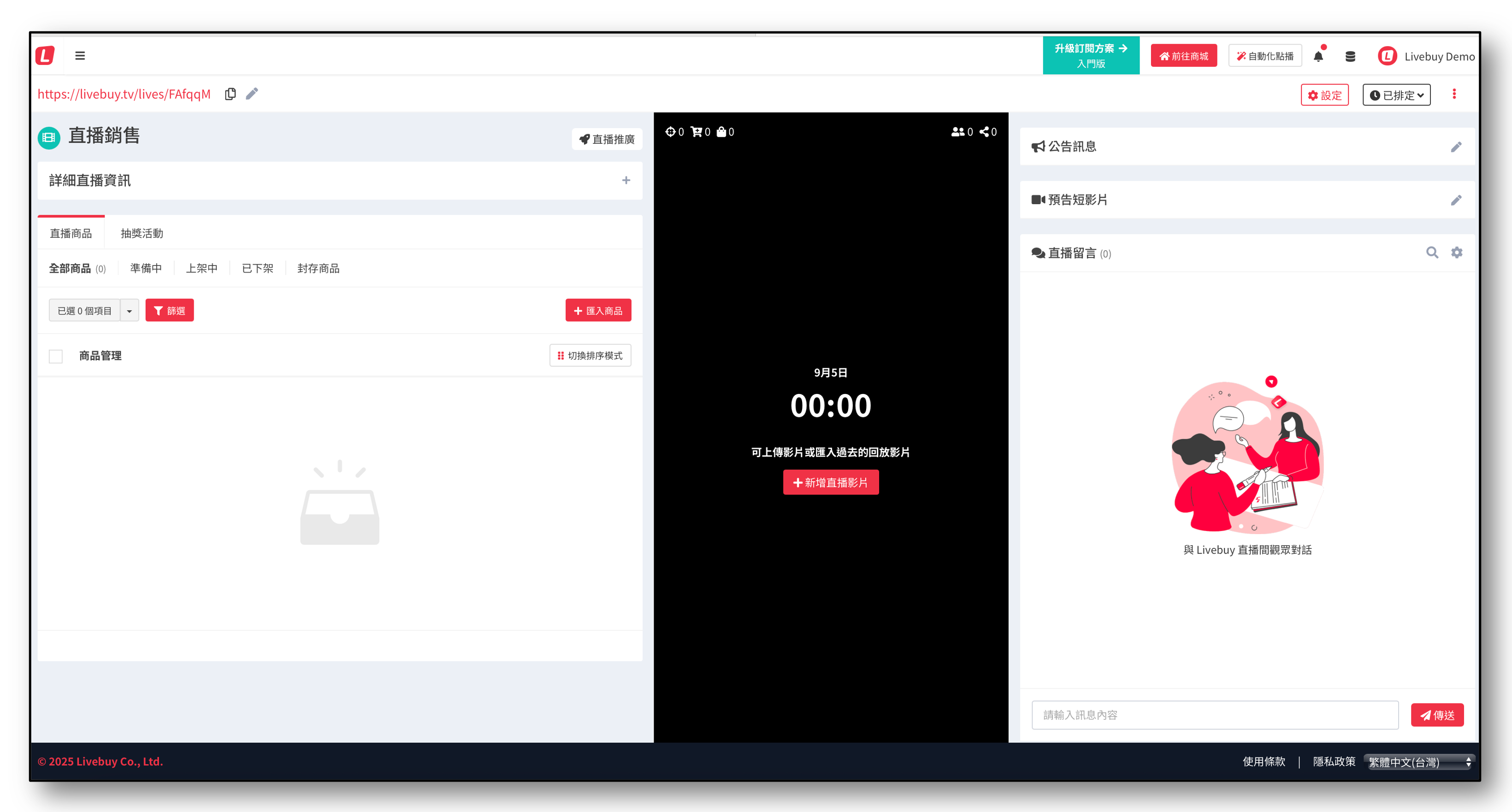 設定完成: 當您完成以上所有直播設定後,系統將會自動開啟一個新的頁面,進入該場直播間的設定完成畫面。您可以在此頁面中: