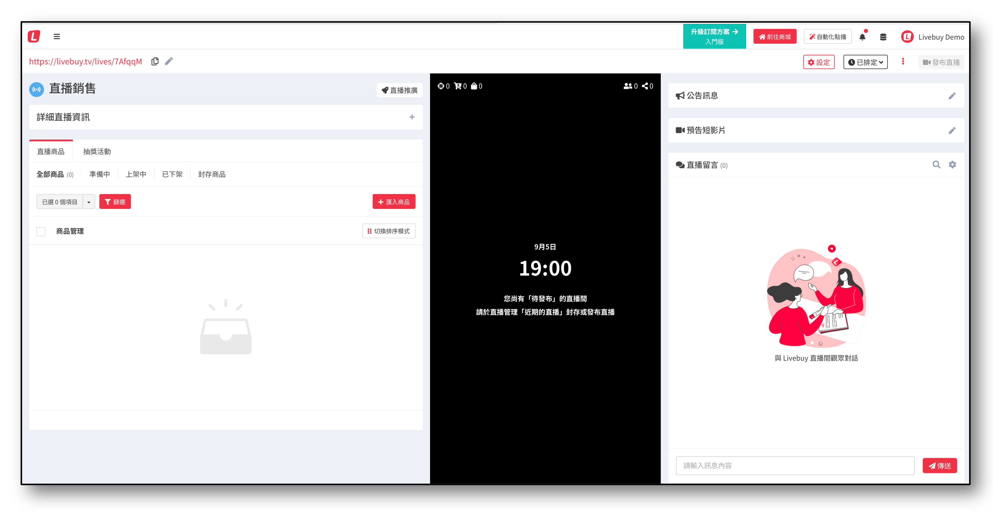 設定直播預告: 設定直播預告後,您的商城首頁或點播影片外掛將會顯示即將開始的直播,您可以設定直播預告後將直播預告分享至您的社群作為預熱。