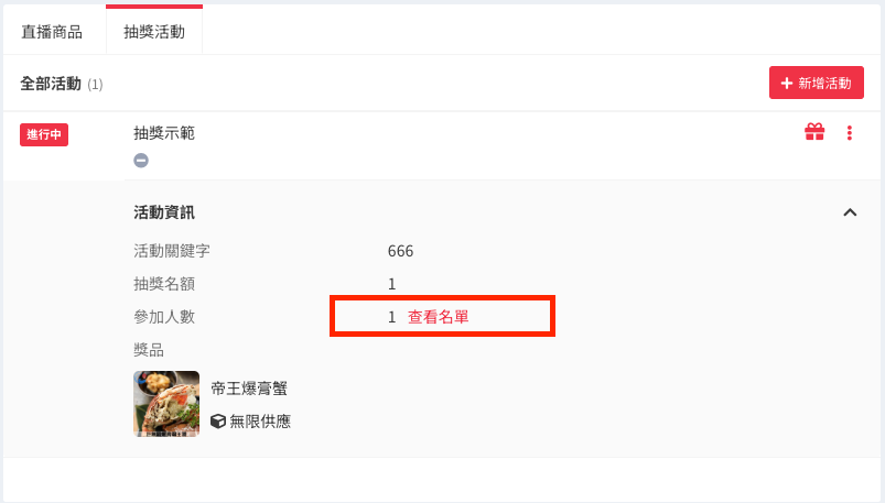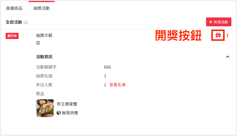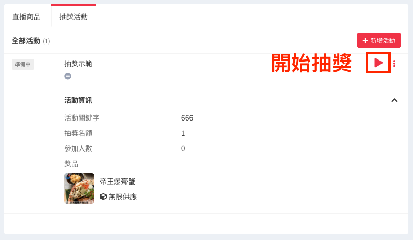 要建立抽獎活動，您可以於直播後台中點擊 「 抽獎活動 」 分頁，點選 「 新增活動 」 即可以開始新增：