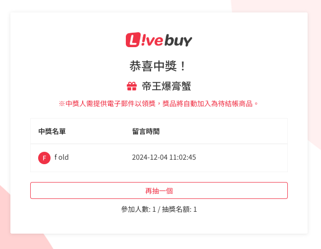 <figure><img src="https://705165073-files.gitbook.io/~/files/v0/b/gitbook-x-prod.appspot.com/o/spaces%2FV3NDyE2p2PVA02XxLVkM%2Fuploads%2F7MxtSILzxvasj9wreCcm%2Fimage.png?alt=media&#x26;token=6040ad00-dbfb-460c-b133-19ebd971ff17" alt="" width="189"><figcaption><p>中獎人畫面</p></figcaption></figure>