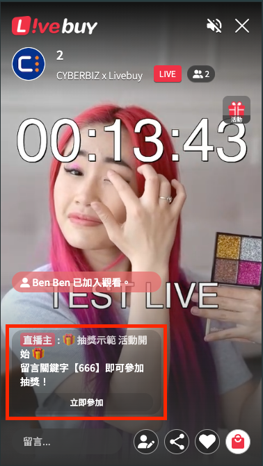 設定完成抽獎活動後，點選開始按鈕，即會開始進行並於留言區發送抽獎開始通知，觀眾可以點擊 「 立即參加 」 或是手動留言加入抽獎。