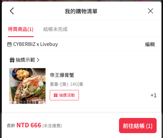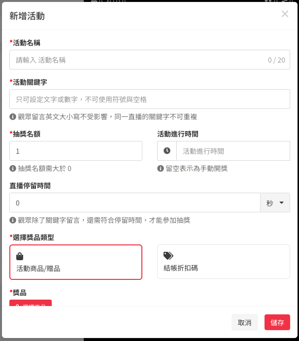 * 活動商品/贈品：您可以直接匯入您於第三方商品庫的商品作為獎品，中獎後觀眾可將獎品直接加入購物車