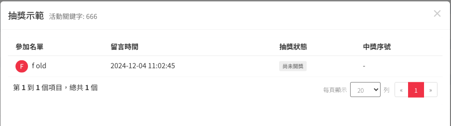 <figure><img src="https://705165073-files.gitbook.io/~/files/v0/b/gitbook-x-prod.appspot.com/o/spaces%2FV3NDyE2p2PVA02XxLVkM%2Fuploads%2Fyth6T5Uw3hZodnmkUNth%2Fimage.png?alt=media&#x26;token=577494cb-2aa5-4937-81c0-5dfec73dc7da" alt="" width="375"><figcaption><p>查看抽獎人數</p></figcaption></figure>