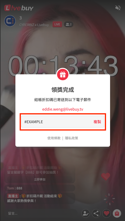 2. 獎品為折扣碼：填寫完成 Email ，觀眾即可直接複製折扣碼使用，中獎明細電子郵件中也會包含折扣碼資訊。