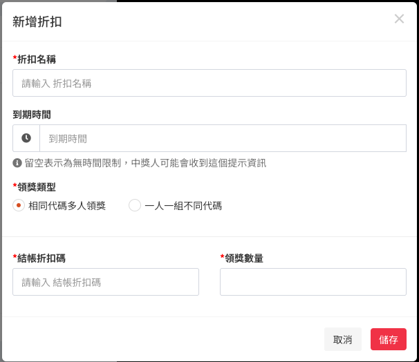 <figure><img src="https://705165073-files.gitbook.io/~/files/v0/b/gitbook-x-prod.appspot.com/o/spaces%2FV3NDyE2p2PVA02XxLVkM%2Fuploads%2Fzm23kB4JyTtXv6xNk4OP%2Fimage.png?alt=media&#x26;token=5cff9e3c-e266-4d79-9935-d285087a56c2" alt="" width="303"><figcaption><p>結帳折扣碼設定</p></figcaption></figure>