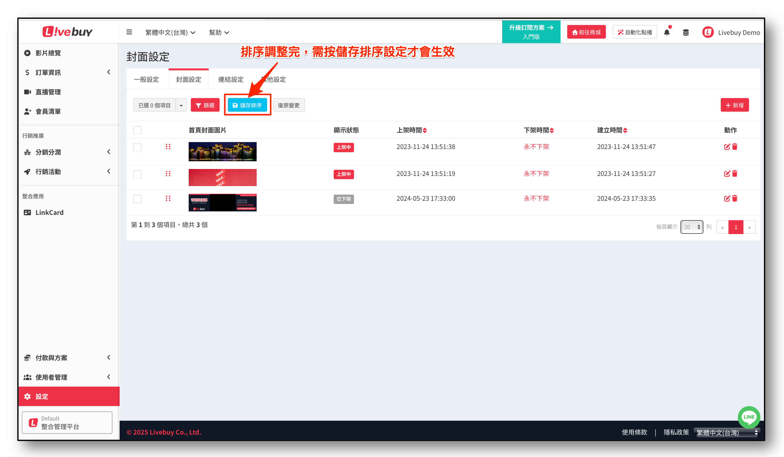 <figure><img src="https://705165073-files.gitbook.io/~/files/v0/b/gitbook-x-prod.appspot.com/o/spaces%2FV3NDyE2p2PVA02XxLVkM%2Fuploads%2FdXowt14QKiMMTG5tcHav%2Fimage.png?alt=media&#x26;token=bda900d2-a518-4917-a3ef-fdcf9c5b84c4" alt=""><figcaption><p>調整排序 - 儲存排序</p></figcaption></figure>